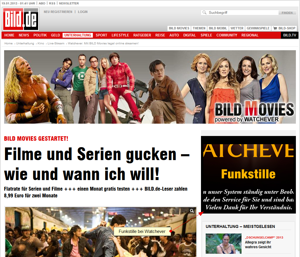 Langsam nerven die ständigen Ausfälle, immer wieder heißt es in letzter Zeit bei Watchever “Funkstille” auch um kurz vor zwei Uhr Nachts. Ist das System überlastet? Auch BILD.de scheint davon betroffen zu sein, an der Stelle an der man normalerweise Werbung für aktuelle Filme und Serien sieht ist aktuell die “Funkstille-Meldung” in einer etwas abgeschnittenen Version zu sehen. Anbei ein aktueller Screenshot der den Ausfall von Watchever dokumentiert.